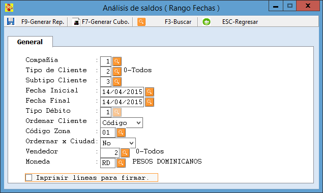 Al acceder a esta opción de reporte se despliega la pantalla de Análisis de saldos (Rango de fechas) el cual contiene campos que funcionan como filtros de búsqueda y una barra de herramientas, para Generar reporte, Generar cubo, Buscar y ESC-Regresar.