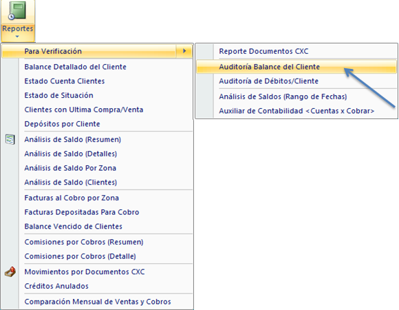 Permite la revisión o verificación de los movimientos que se realizaron para saber el balance del cliente, los status. Para acceder a este menú se le da clic a Reportes/Para verificación/Auditoria balance del cliente. Como se muestra en la figura siguiente.