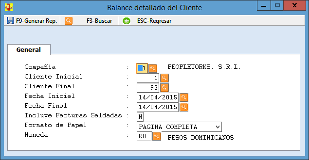 Esta pantalla saldrá cuando de clic en el Balance detallado del cliente, la cual contiene campos que funcionan como filtros de búsqueda y una barra de herramientas, F9-Generar reportes, F3- Buscar y ESC-Regresar.