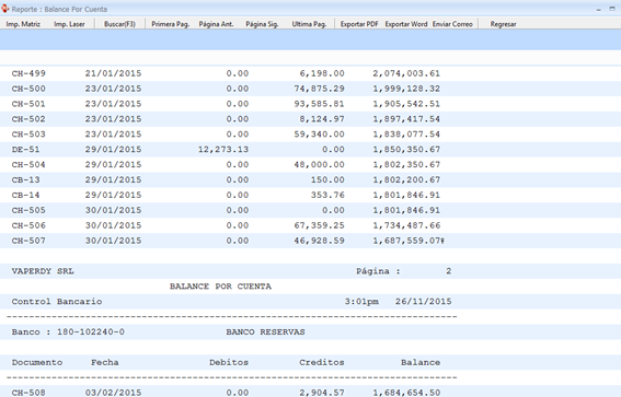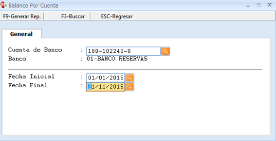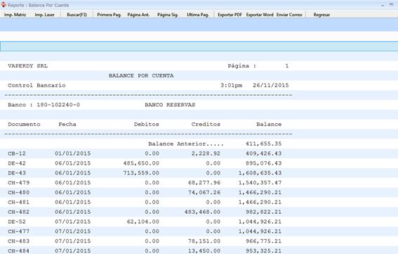 En este caso seguimos trabajando con la cuenta del Banco Reservas, damos doble clic encima luego asignamos las fechas iniciales (1/1/2015) y la fecha final (21/11/2015) y nos muestra esta ventana: