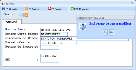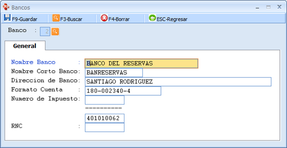 Nota: En esta parte es de suma importancia poner el número de RNC del banco porque este servirá como por ejemplo si se hace un cargo bancario y tiene un comprobante fiscal para que el sistema sepa para llevarlo a reportar la DGI necesitan el RNC.