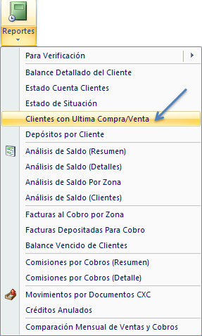 Este reporte contiene los datos de los clientes que realizaron su última compra o venta. Podemos acceder a este menú dándole clic a Clientes con última compra /venta. Como se muestra a continuación.