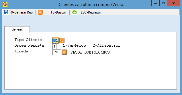 Esta pantalla saldrá cuando de clic en el Clientes con última compra/venta, la cual contiene campos que funcionan como filtros de búsqueda y una barra de herramientas, F9-Generar reportes, F3- Buscar y ESC-Regresar.