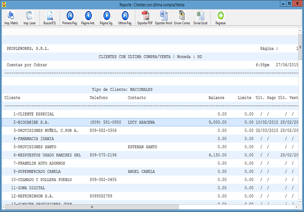Para generar este reporte se le da un clic a F9-Generar Rep., luego saldrá esta pantalla, lo cual contiene el balance, limite, último pago de los clientes.