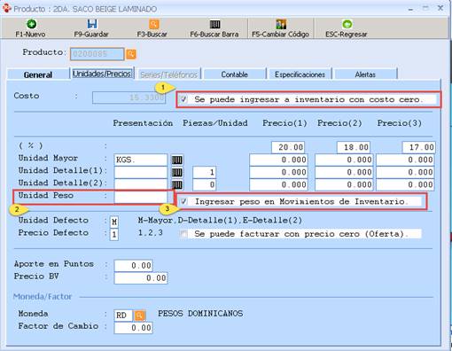 Se debe colocar a los productos que son Ej.: SACOS los siguientes parámetros, para determinar que este producto va a tener un tratamiento diferente cuando se ingrese al inventario y el que vamos a utilizar para calcularle costo, también se puede marcar si se debe ingresar el peso en el caso de que el producto lo requiera.