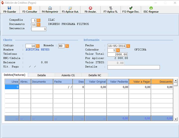 Esta ventana de créditos pagos sirve para crear lo recibos y anularlos se crea de la siguiente manera: