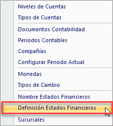 Luego que ya tenemos un título, seleccionamos la opción de definición de estados financieros, ubicada en el menú de mantenimientos iniciales del módulo de contabilidad. Luego de elegir esta opción, procedemos a llenar los datos de la pantalla como comentamos a continuación.