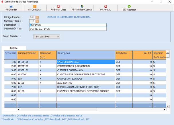 La filosofía de esta pantalla es que cuando vemos el estado financiero que se desea crear, por cada grupo que se desea tener en el reporte, debe crearse aquí para cada título definido.