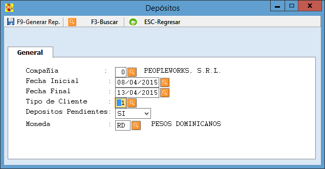 Esta pantalla saldrá cuando de clic Depósitos por cliente, la cual contiene campos que funcionan como filtros de búsqueda y una barra de herramientas, F9-Generar reportes, F3- Buscar y ESC-Regresar.