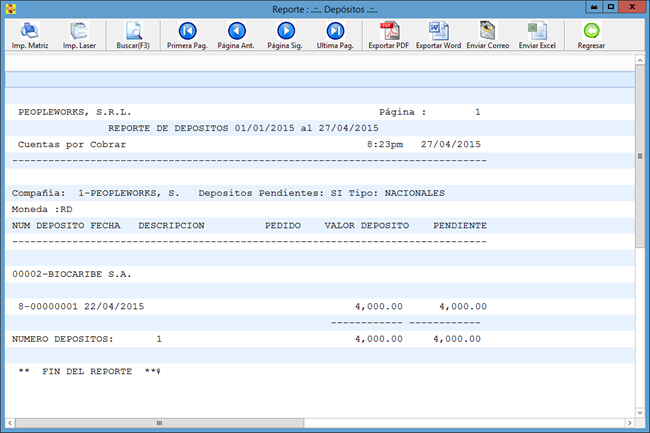 Este será el reporte que se generará, lo cual contiene número de depósito, el valor depositado, entre otros.