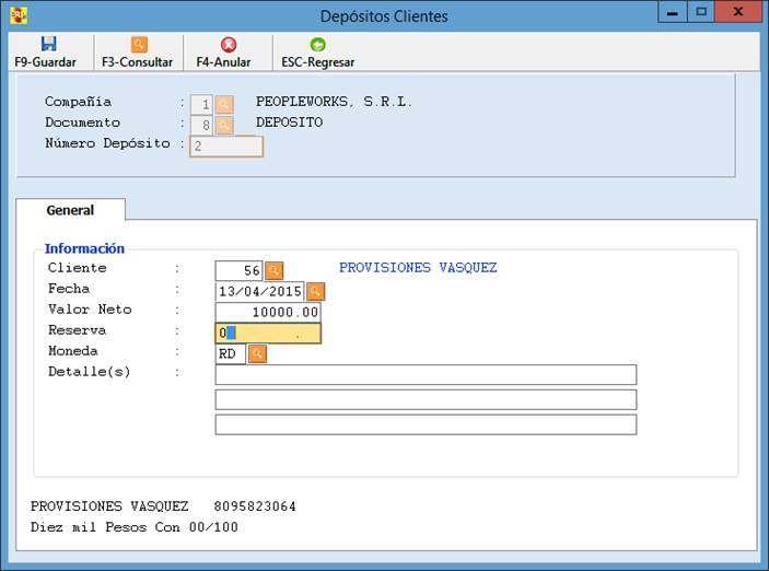 Son acciones mediante la cual una persona física o jurídica deja en una institución financiera, para su custodia y administración, una serie de valores. Para realizar un depósito se elige Cuenta por cobrar/Maestros/ Depósitos. Como se muestra a continuación.