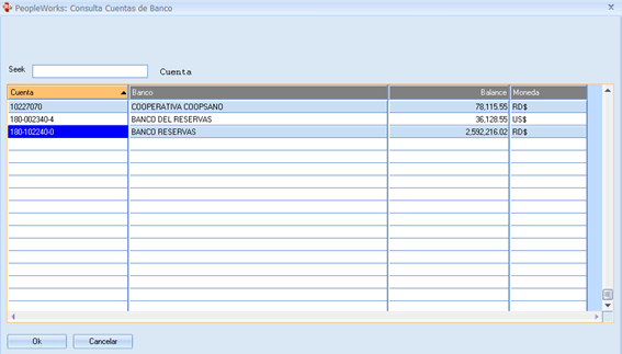 Elegimos la cuenta de banco de banco pulsando la lupa que se encuentra al lado de cuenta de banco y nos muestra la diferentes cuentas elegimos dando doble clic encima de la cuenta seleccionada.