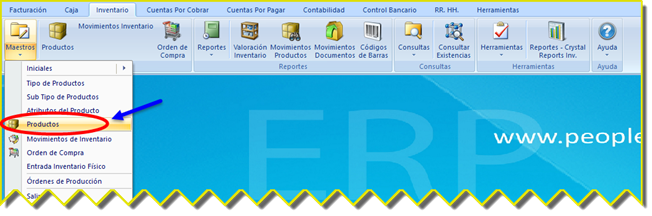 La ilustración 60 muestra la ubicación de la herramienta Productos dentro de la categoría Maestros del programa.