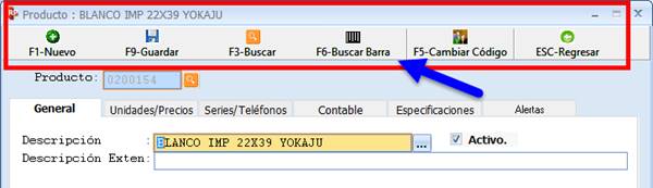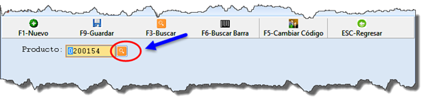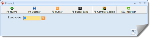 La herramienta Producto contiene una barra que permite Crear Nuevo producto/ Guardar/ Buscar/ Buscar Barra (búsqueda por código de barra) /Cambiar Código/ Regresar.