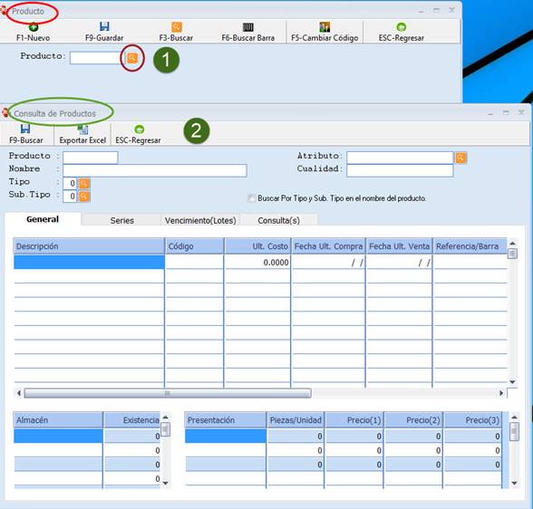 Haciendo clic en la Lupa Naranja (paso 1), de la herramienta Producto se despliega una segunda pantalla llamada Consulta de Productos (paso 2).