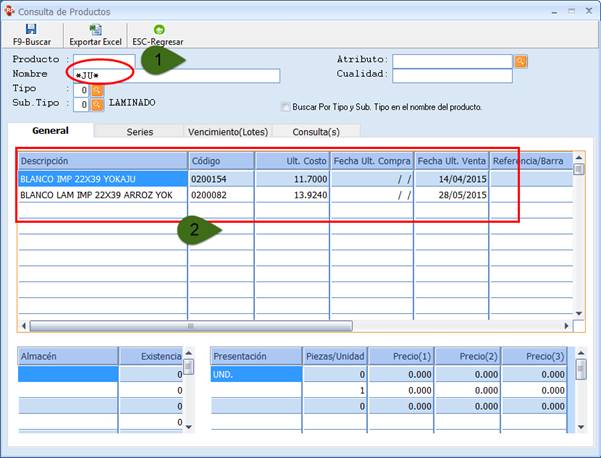 En la ventana Consulta de Productos se realiza la búsqueda en la parte Nombre escribiendo algunas letras del nombre de producto a buscar (paso 1). Presionando ENTER el sistema despliega los resultados que coinciden con el Nombre o letras que ha ingresado el Usuario (paso 2). Se muestra el proceso de Consulta de Productos.