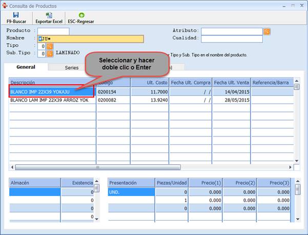 Una vez aparecen los resultados de la búsqueda, se selecciona el Producto al cual se le va buscar las informaciones que tiene registrado en el sistema y se hace doble clic o Enter.