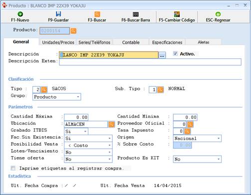 Se muestra las informaciones del producto seleccionado. Las informaciones del producto van desde la clasificación (Tipo, Subtipo y Grupo), las descripciones (extendidas y pequeñas) y algunos parámetros de la venta y el costo (cantidad Max y Min, ubicación, tasa de impuesto, etc.).