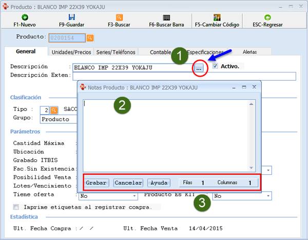 Al hacer clic al botón ubicado en la descripción del producto (paso 1), abre una segunda ventana donde se puede agregar una Nota (paso 2). Terminado de agregar la nota esta la barra inferior con las opciones de Grabar /cancelar/ ayuda (paso 3).