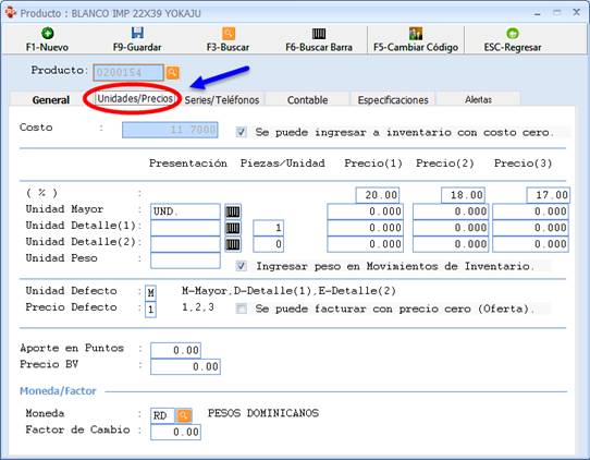 La pestaña Unidades/Precios contiene las informaciones del Producto con la cantidad existente en Almacén y los Precios.
