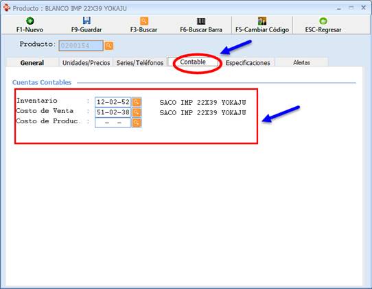 Otra pestaña es la Contable donde se pueden definir las cuentas para hacer la contabilidad a nivel de Artículos, Tipo de producto.