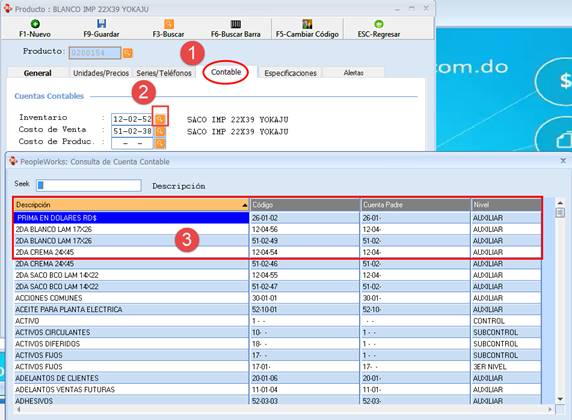 El proceso de la parte Contable se muestra en la ilustración 70. Elegir la pestaña Contable del Producto seleccionado (paso 1), luego se hace clic en la Lupa Naranja en Inventarios (paso 2) y se despliega una segunda ventana (paso 3) con las informaciones del producto en consulta.