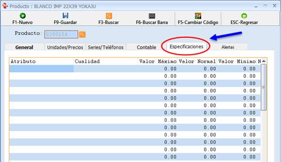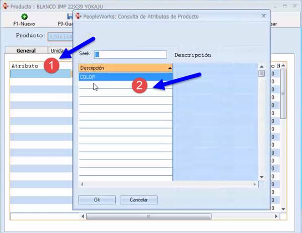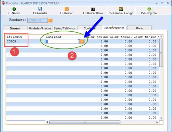 En la pestaña Especificaciones el Usuario puede agregar Atributos haciendo doble clic en el cuadro Atributo (paso 1) y luego digitar el nombre (paso 2).