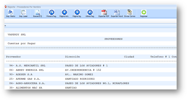 Muestra una lista de todos los proveedores por nombres y otros datos complementarios como, dirección y teléfono.