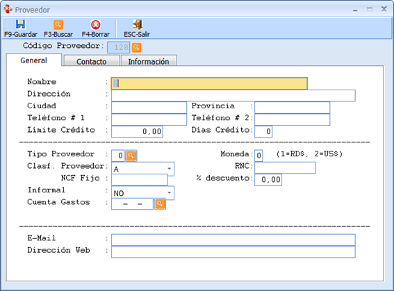 Luego en esta primera pantalla hay un código que se llama (Código de proveedor) que el sistema lo hace automático cada vez que se va creando un proveedor, se le da a la tecla ENTER para crear uno nuevo.