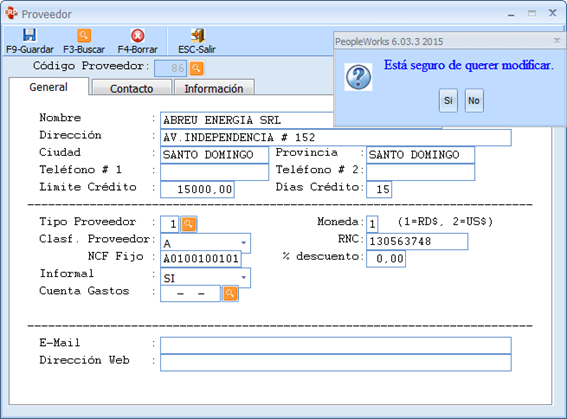 Modificar Suplidores: Para modificar los suplidores que quede algún datos erróneo o algún dato que falte se hace el mismo proceso se escoge el proveedor si no sabe cuál se procede a buscar se elige y entonces se modifica lo que se vaya a cambiar y da a guardar el sistema le dará un mensaje si quiere modificar.