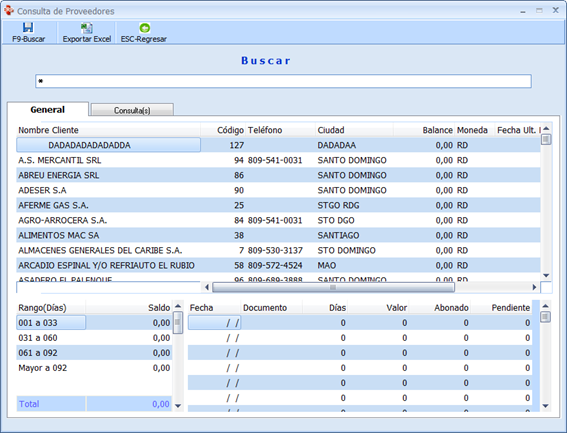 Sale la misma interfaz de la misma pantalla solo cambia un buscador con una tabla en blanco con do pestaña general y consultas y abajo detallándole los datos de ese proveedor, En el buscador se puede poner cualquier dato o el nombre si se tiene del suplidor a buscar y lo selecciona le da al a tecla ENTER y se busca luego se da a ENTER y ya se muestra lo datos de ese proveedor si se quiere consultar algún dato.