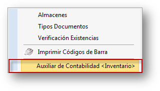 Para ejecutar esta opción debemos ir al menú de Reportes, luego el sub. Menú reportes para verificación y seleccionamos la opción “Auxiliar de Contabilidad <Inventario> “. Tal y como muestra la figura a continuación.