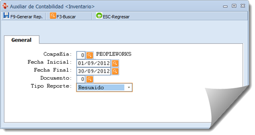 Luego de seleccionar esta opción le aparece una pantalla donde puede generar el reporte por un rango de fechas determinado y utilizando uno o todos los documentos existentes en el módulo de inventario, como muestra la figura siguiente.