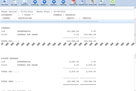 A continuación, una muestra del reporte luego de ser generado, al igual que todos los reportes en esta aplicación se puede exportar a los formatos más conocidos e incluso enviarlo por correo electrónico.