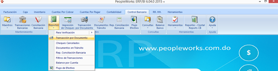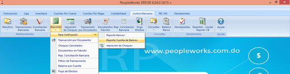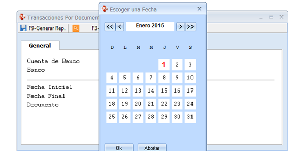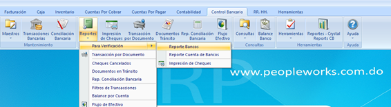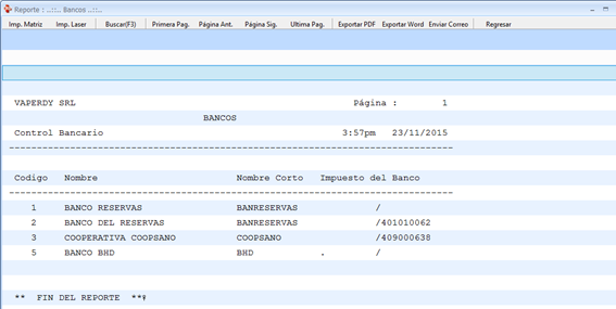 Aquí tenemos la barra de herramientas donde pulsamos reporte y nos aparece el catálogo completo, para iniciar hacemos consulta a reporte de banco y nos muestra esta pantalla: