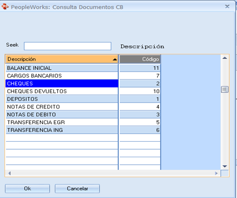 Pulsamos la lupa donde dice documento y nos muestra una lista de transacciones en este caso elegimos cheque.