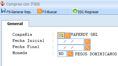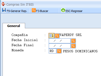 También este Módulo, cuenta con las opciones de compras con ITBIS o sin ITBIS. Estas dos opciones siguen el mismo parámetro, la diferencia es que uno mostrará un reporte con las compran realizadas con facturas aplicando ITBIS. Sin embargo, sin ITBIS, este mostrará un reporte en resumen de todas las facturas efectuadas.
